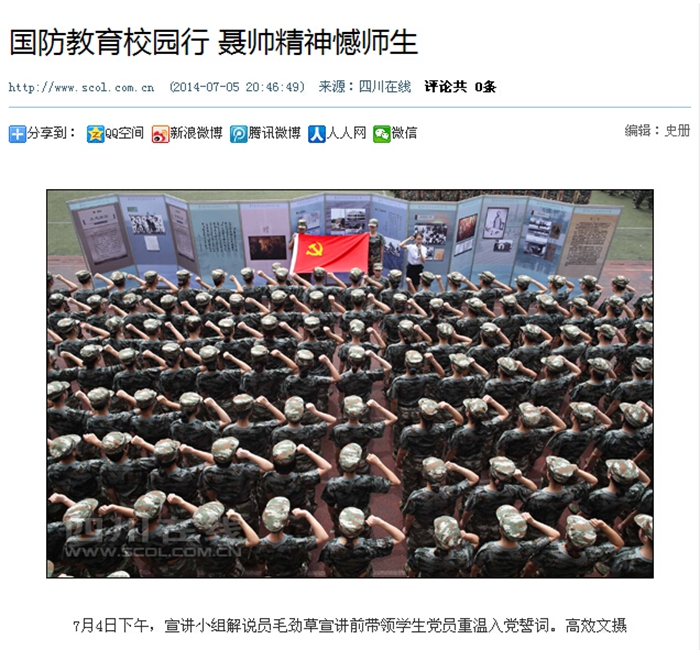 7月2日,聂荣臻元帅陈列馆报告团成员一行5人赴重庆邮电学院,为4000余名参加军训的大一新生通过报告会的形式开展党课教育,此次报告会是我馆第1000次宣讲。各大媒体争相报道。下图为四川在线对我馆宣讲报道概况。