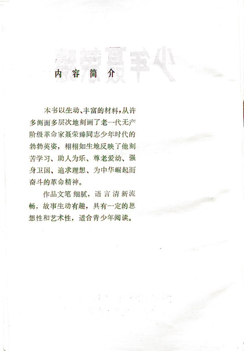 聂荣臻同志的青少年时期是在中国最黑暗、最腐朽的时代中度过的。但是他从小勤奋好学,青年时期就已博览群书,尤善独立思考;他不畏强暴,奋勇上进;他尊敬老人,热爱师长;他关心同学,助人为乐;他胸怀大志,追求真理;他热爱中华,痛恨国贼;他怀着烈火一般的激情,投身于保路运动和五四运动的革命洪流之中。虽然,在这本小书里,我们不可能全面地、系统地介绍聂帅战斗的一生,然而,我们将努力地从他青少年时期的各个侧面,描绘展示他的勃勃英姿和为祖国的崛起而奋斗不止的献身精神。